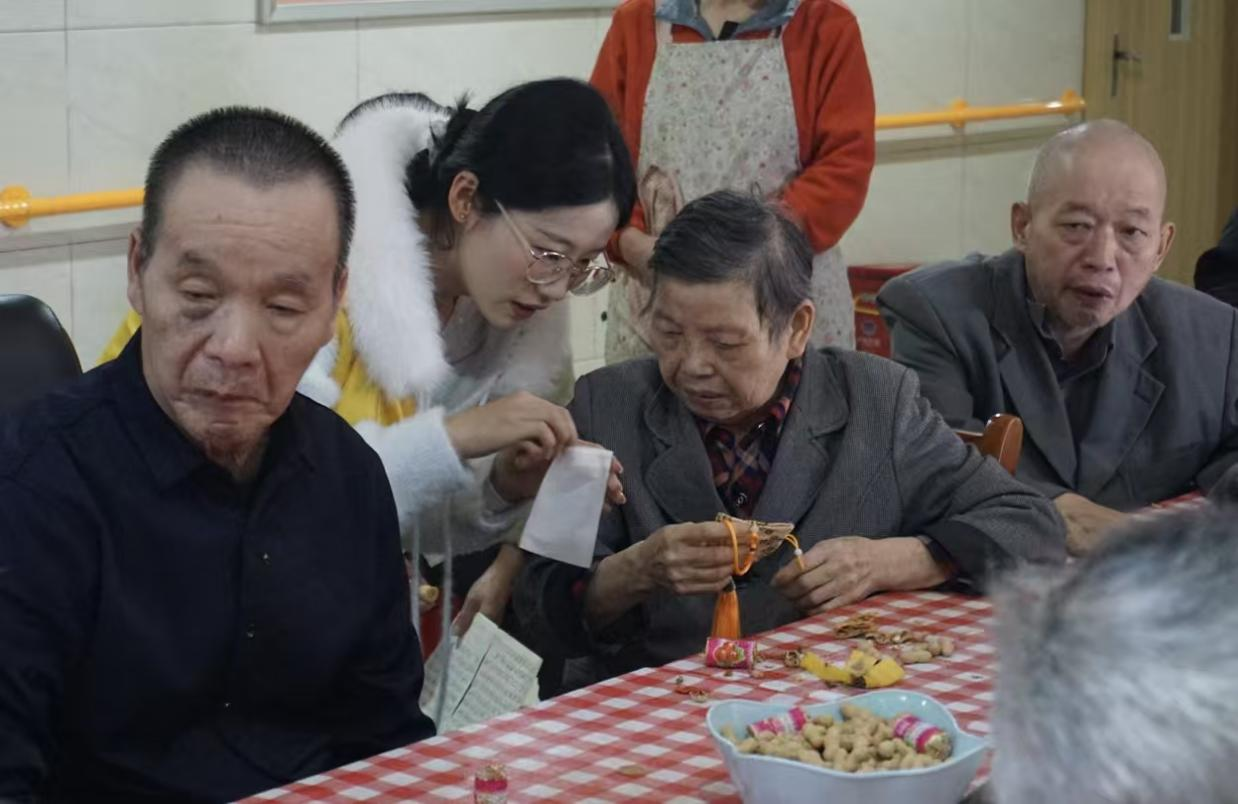 活动在温馨融洽的氛围中拉开帷幕。学生党员们带来了精心准备的文艺节目。红色朗诵《润泽秋意,芳华予您》以饱满的热情和铿锵的语调,致敬峥嵘岁月;手势舞《东方红》则以柔美而庄重的形式,唤起老人们的时代记忆,不少老人随着旋律轻声跟唱,现场洋溢着浓浓的爱国情怀与老少共融的温馨。随后进行的香囊制作环节将活动推向高潮,党员志愿者与老人们结对协作,讲解香囊习俗,协助制作具有安神、驱蚊等功效的香囊。制作过程中,大家亲切交流,小巧的香囊成为连接两代人情感的桥梁。