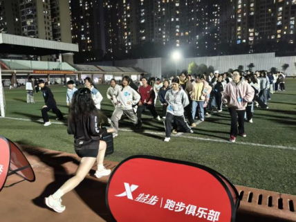 傍晚七点未至,运动场的签到处已聚满参与同学。大家有序领取集章卡和荧光装备。特步后湖跑步俱乐部的教练率先站到队伍前方,带领大家开展热身运动,清脆的指令穿透人群:“膝盖抬高,手臂打开,把全身的活力都‘抖’出来!”随着节奏舒展肢体、跳跃热身,运动场的氛围提前被点燃。